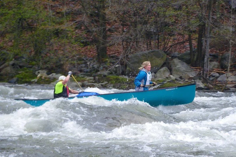 Designed with a long water line and planning hull with a nearly non-existent bow and stern rocker, the Penobscot is not, at first glance, an ideal canoe for advanced backcountry tripping, where whitewater may become a factor. The Penobscots' true whitewater potential lies in its width, allowing it to maneuver through narrow rock gardens found in both the Quetico Superior Country and the large river basins feeding into Hudson Bay. Additionally, a thwart located behind the bow seat allows for a bow paddler to sit just behind the webbed seat, lifting the bow profile for running larger wave trains and drop pools.